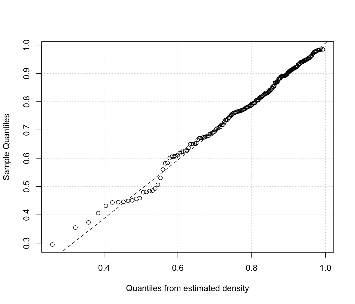 densityMclustBounded.diagnostic(dens, type = "qq")